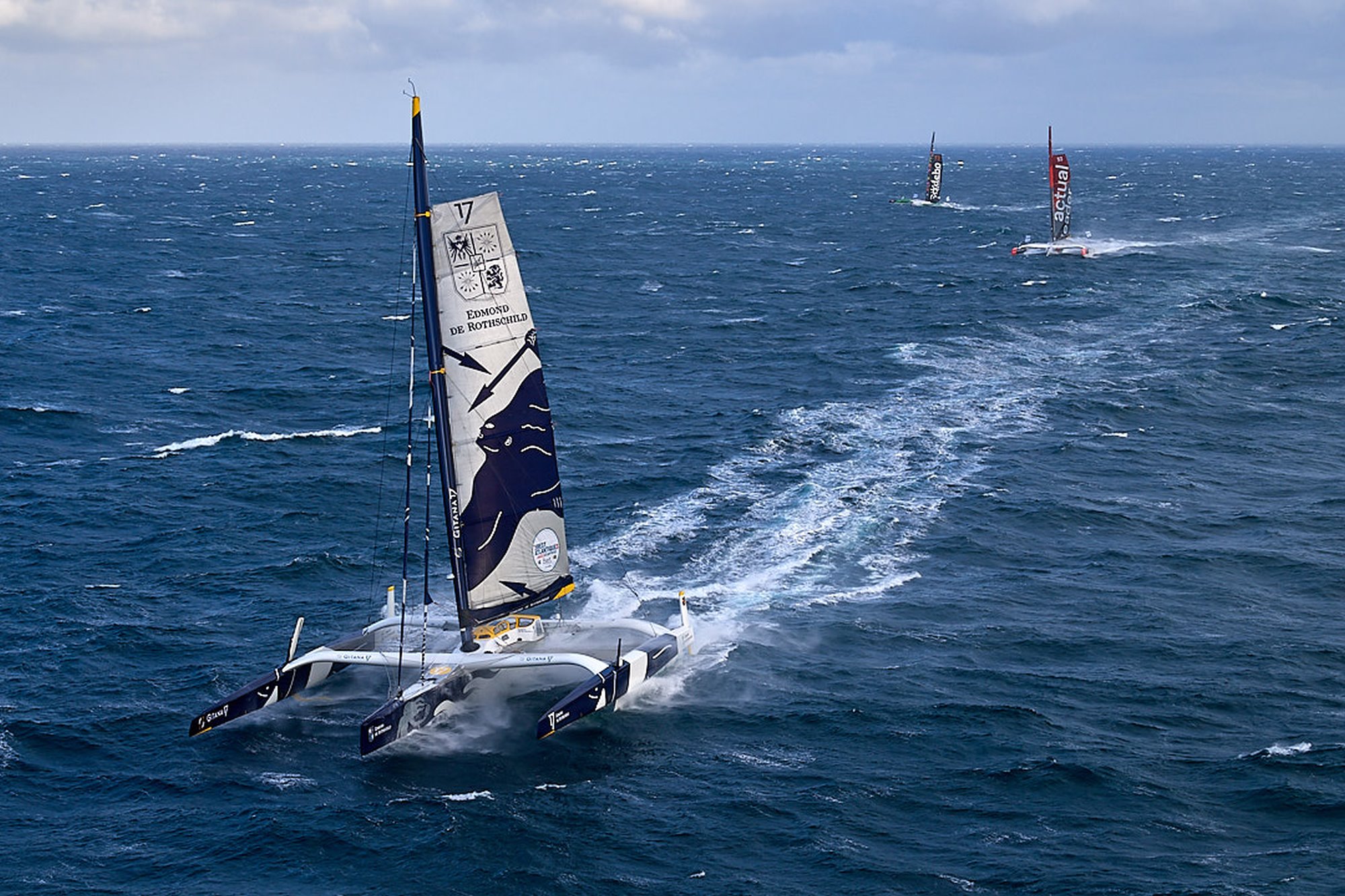 Le dimanche 3 novembre, date initiale du départ de la Brest Atlantiques, la première tempête automnale balaye les côtes bretonnes. Les quatre géants en lice et leur équipage doivent patienter 48h pour laisser passer le gros du mauvais temps. Mardi 5 novembre à 11h, la course s’élance en catimini de Brest. Pourtant, les conditions météos qui règnent sur la Chaussée de Sein resteront longtemps dans les mémoires : 30 nœuds et près de 5 mètres de creux. « Je n’ai pas vu une telle mer depuis le Pacifique Sud sur la Volvo Ocean Race, c’est impraticable ». Les premiers mots du large de Yann Riou, le mediaman du Maxi Edmond de Rothschild donne le ton.