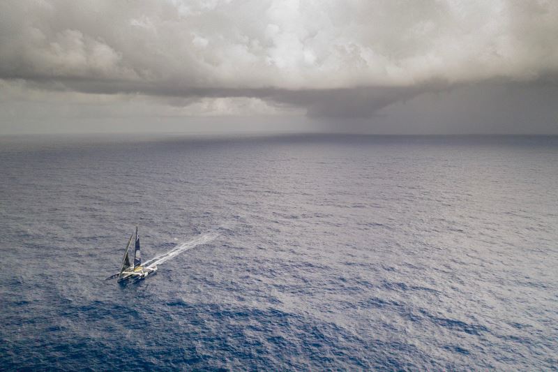« On a eu un problème sur la galette de gennaker . La galette ou enrouleur, c’est ce qui permet de rouler la voile et là on ne pouvait plus le faire. Le bout d’amure du gennaker était sorti de l’enrouleur et il était coincé. C’était un vrai problème, parce que la voile fait 400 m2, et que nous arrivons dans une zone potentielle de grains où ce type d’incident peut avoir des conséquences bien plus graves », résumait Charles Caudrelier. En effet, le plat de résistance de la journée est bel et bien l’entrée et la traversée de la Zone de Convergence Intertropicale. En tête de cordée, Franck Cammas et Charles Caudrelier seront logiquement les premiers à en subir les effets. Les deux marins, qui ne comptent plus leurs passages dans cette zone en course, savent parfaitement qu’une fois que l’on pointe ses étraves par ici, il faut être sur le qui-vive et opportunistes au gré des nuages, avec ou sans vent, qui se présentent.