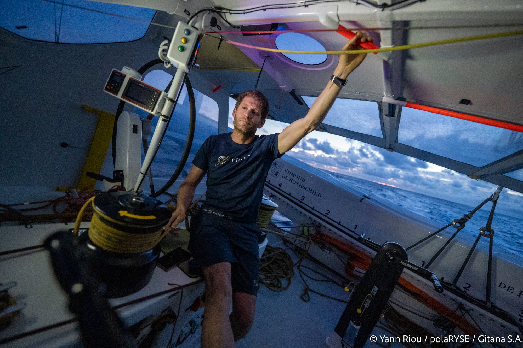 « C’est une remontée de l’Atlantique assez atypique et pas vraiment des plus rapides. Nous sortons actuellement de l’accélération du Cabo Frio, pointe dans l’Est de Rio de Janeiro. Nous allons virer de bord dans les prochaines heures pour entamer un long tribord dans des conditions de vent mollissant. Il y a très peu de gradient de pression dans l’Ouest de l’anticyclone de Sainte-Hélène, avec une dorsale qui s’étend jusqu’aux côtes brésiliennes. C’est une situation d’alizé très faible avec un anticyclone très étendu sur l’Atlantique Sud. Nous aurions bien sûr préféré avoir un alizé musclé et l’angle qui habituellement nous permet ici de débrider un peu et d’accélérer. Mais là, nous devrions garder un angle assez serré jusqu’à Recife et la pointe Nord-Est du Brésil. Nos poursuivants, entre 1 800 et 2 000 milles derrière, ne sont pas du tout dans le même système météo que nous et vont bénéficier de conditions plus favorables. Dans les prochains jours, l’écart va se réduire et il ne faudra pas trop s’attarder sur ces milles concédés. »