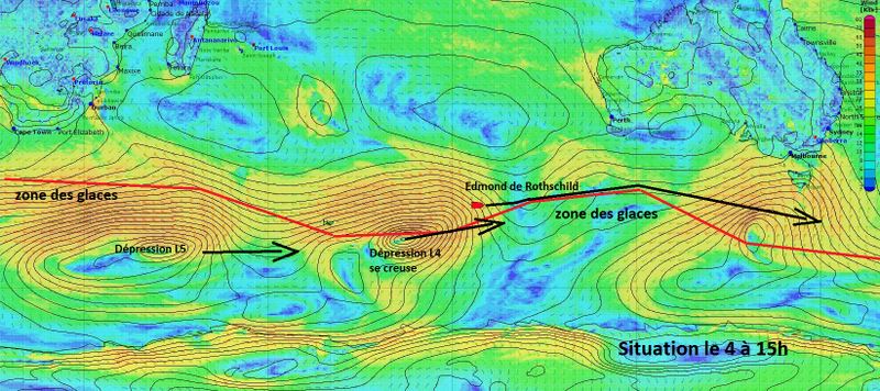 Tandis que le Nautic de Paris se tient depuis hier Porte de Versailles, les ouvreurs du Vendée Globe poursuivent leur course à plein régime dans l’océan Indien. En effet, selon les dernières estimations le duo de tête pourrait doubler le deuxième cap du tour du monde, le cap Leeuwin, dès demain après moins de vingt-neuf jours de mer. Ce passage interviendra 24h plus tard pour Sébastien Josse, toujours troisième à 586 milles du leader. Mais pour l’heure, ce qui concerne plus particulièrement le skipper du Gitana Team, c’est la météo qui s’annonce dans son sillage et qui sera bientôt dans les voiles d’Edmond de Rothschild.