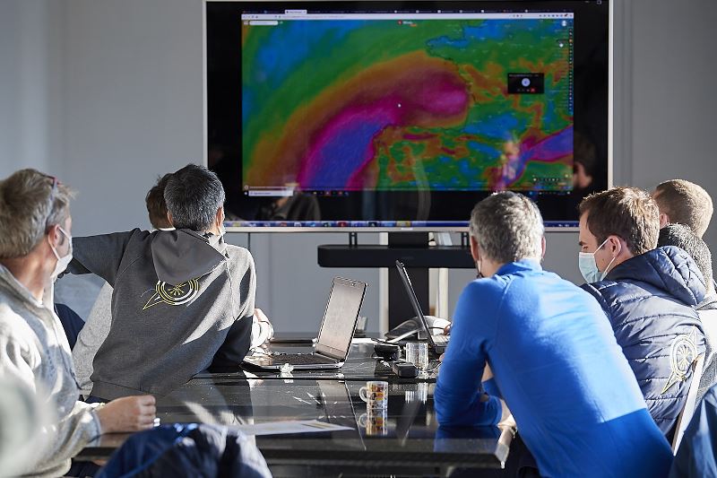 Après un dernier briefing météo à terre et à distance avec Marcel van Triest, routeur et 7e homme, les six marins de l’écurie aux cinq flèches ont rejoint un peu après 15 heures le trimaran de 32 mètres, qui depuis plusieurs jours piaffe d’impatience de repartir à la chasse au titre de voilier le plus rapide autour du monde. Choisir le jour et l’heure de son départ au regard des prévisions météo décryptées et analysées avec une précision chirurgicale, c’est tout un art qui fait la particularité du Trophée Jules Verne. À ce petit jeu qui consiste à choisir la meilleure fenêtre de lancement, l’équipage du Maxi Edmond de Rothschild a dû ronger son frein et s’armer de solides convictions pour bien prendre leur mal en patience. Mais cette fois-ci, ça y est, devant un horizon météo qui se dégage sur tout l’Atlantique, ils sont bel et bien dans les starting-blocks, fin prêts à s’élancer dans cette course effrénée contre le chronomètre. « Nous avons pris un départ en tout début de stand-by, mais nous savions que la situation n’était pas idéale. Depuis notre retour, nous avons vu et observé six fenêtres qui se sont refermées. Nous sommes donc particulièrement contents d’y aller dans une configuration météo qui, bien que toujours un peu incertaine au niveau des systèmes dépressionnaires de l’hémisphère Sud, nous ouvre une belle opportunité », explique Franck Cammas.