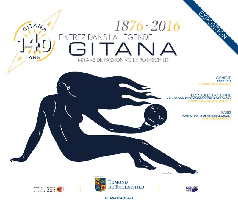 Enfin, nous ne pouvons évoquer les Gitana sans souligner leur élégance. Début novembre, Sébastien Josse empruntera le chenal des Sables d’Olonne à bord du Mono60 Edmond de Rothschild (Gitana 16) qui porte sur ses flancs, l’aigle et le lion du blason Rothschild. Lignes tendues, bleu nuit aux reflets presque scintillants et cette boussole dont le cœur abrite les cinq flèches, tout chez les Gitana rend hommage aux armoiries familiales. Dessinés par Marc P.G. Berthier durant l’ère Edmond de Rothschild, les voiliers armés depuis furent souvent signés du navigateur-designer Jean-Baptiste Epron. En cette année anniversaire, un autre regard est venu se poser sur la sirène Gitana qui accompagne les marins depuis plus de 15 ans. A découvrir sur l’affiche officielle de l’exposition, cette nouvelle silhouette de femme plus déesse que gitane, globe à la main et visage tourné vers l’horizon, a été créée par le street artiste américain, Cléon Peterson.