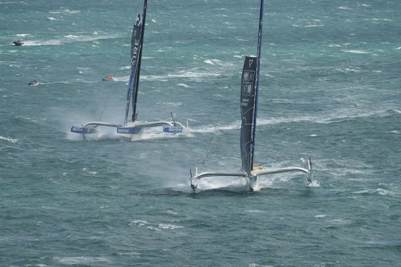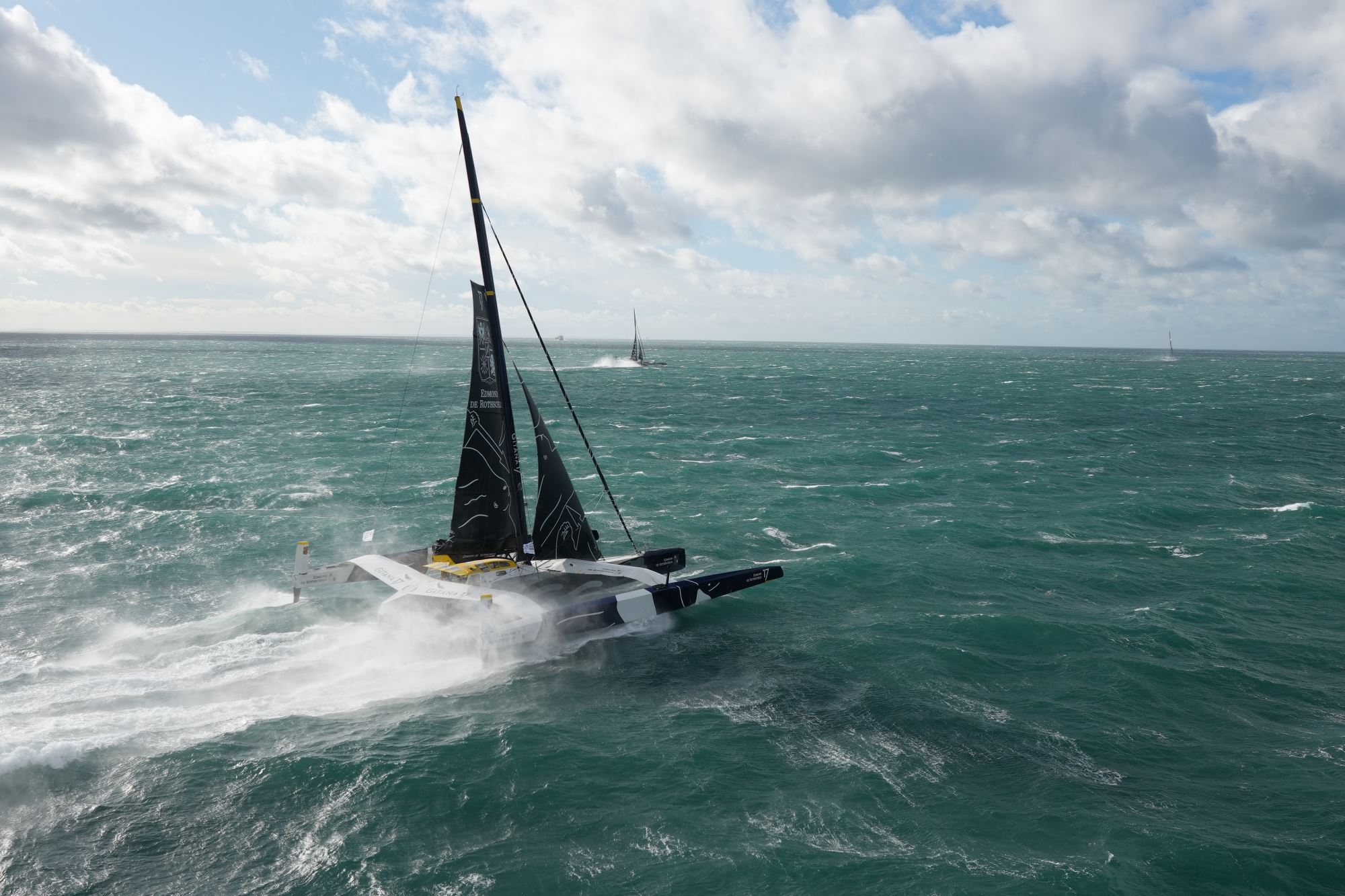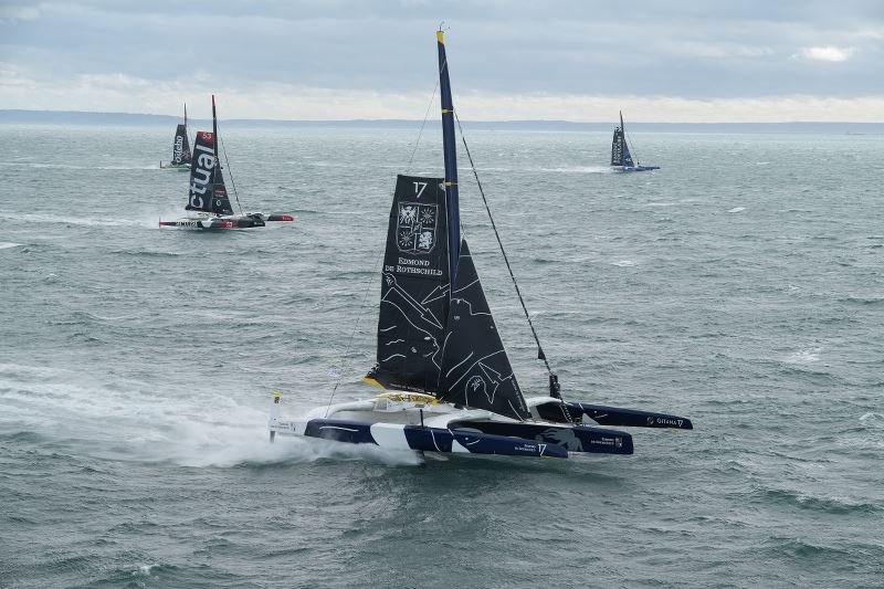 À 13h05 tapantes, les cinq ULTIM engagés dans la Route du Café s'élançaient sur les chapeaux de roues. Un vent de Sud Sud-Ouest autour des 30 noeuds moyens balayait la baie du Havre et le cap de la Hève au moment du top départ.