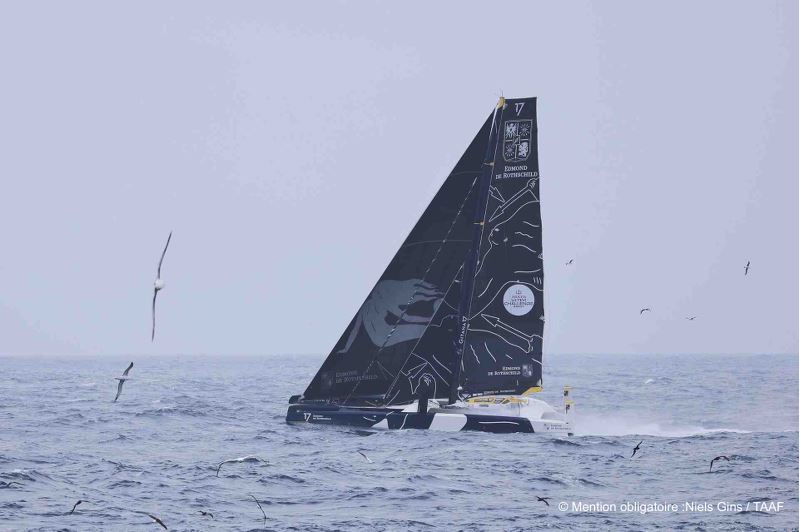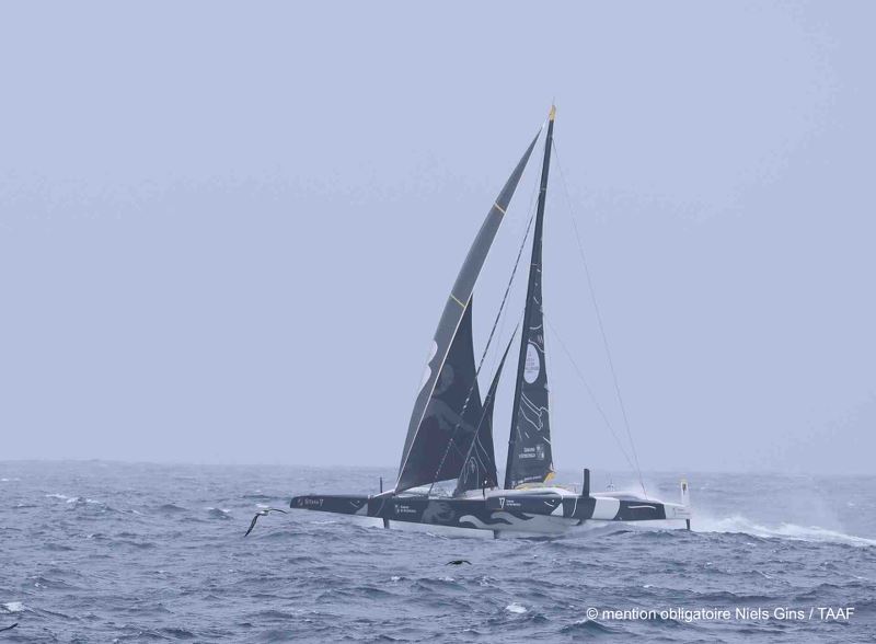 En fin de nuit en France et tandis qu’il fait déjà jour sur le pont du Maxi Edmond de Rothschild alors lancé à plus de 30 nœuds par 51° Sud en approche des Kerguelen, le skipper est contacté en VHF par un bateau de pêche français de l’armement SAPMER. Le Mascareignes III est un palangrier en campagne dans les mers australes et il croise à quelques longueurs du géant de 32 mètres. À son bord, Niels Gins, scientifique et contrôleur des pêches TAAF, grand armateur de course au large et « addict » de la cartographie de l’Arkea Ultim Challenge va immortaliser le moment : Gitana 17 en vol au milieu des albatros ! « Étant moi-même voileux, c’était un vrai plaisir de croiser Gitana ! Je suis toutes les 2/3h la cartographie, mais je ne pensais pas qu’il passerait si près » nous confiait le jeune scientifique.