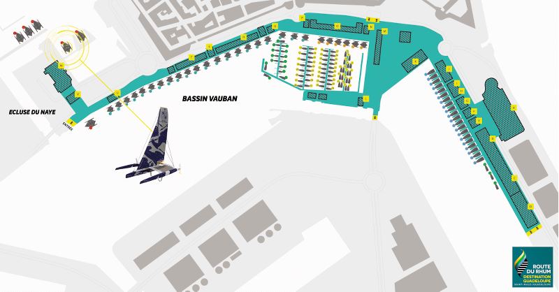 32 mètres de long par 23 mètres de large, sans compter ce qui dépasse de part et d’autre des flotteurs au niveau des appendices, l’écluse du Naye qui marque la porte d’entrée obligatoire vers les bassins de la cité corsaire n’est tout simplement pas assez large pour imaginer faire entrer dans des conditions de sécurité optimale cinq des six concurrents. Ainsi Edmond de Rothschild sera amarré au pied des remparts mais côté gare maritime de la Bourse.
